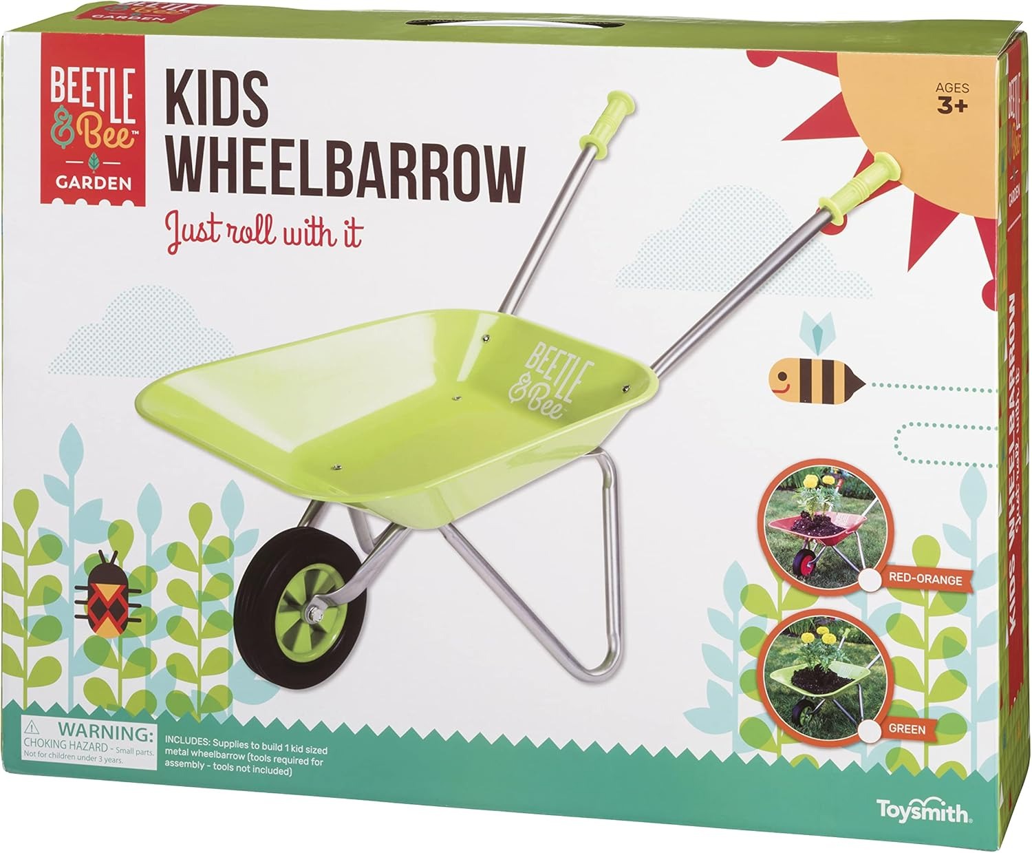 Carretillo de metal que mide 32 pulgadas de largo y puede contener 1 pie cúbico de tierra aproximadamente. Con mangos de fácil agarre con bordes redondeados. El carretillo tiene una bandeja de metal con lados en ángulo poco profundo y 1 rueda de goma delantera, lo que la hace lo suficientemente resistente.