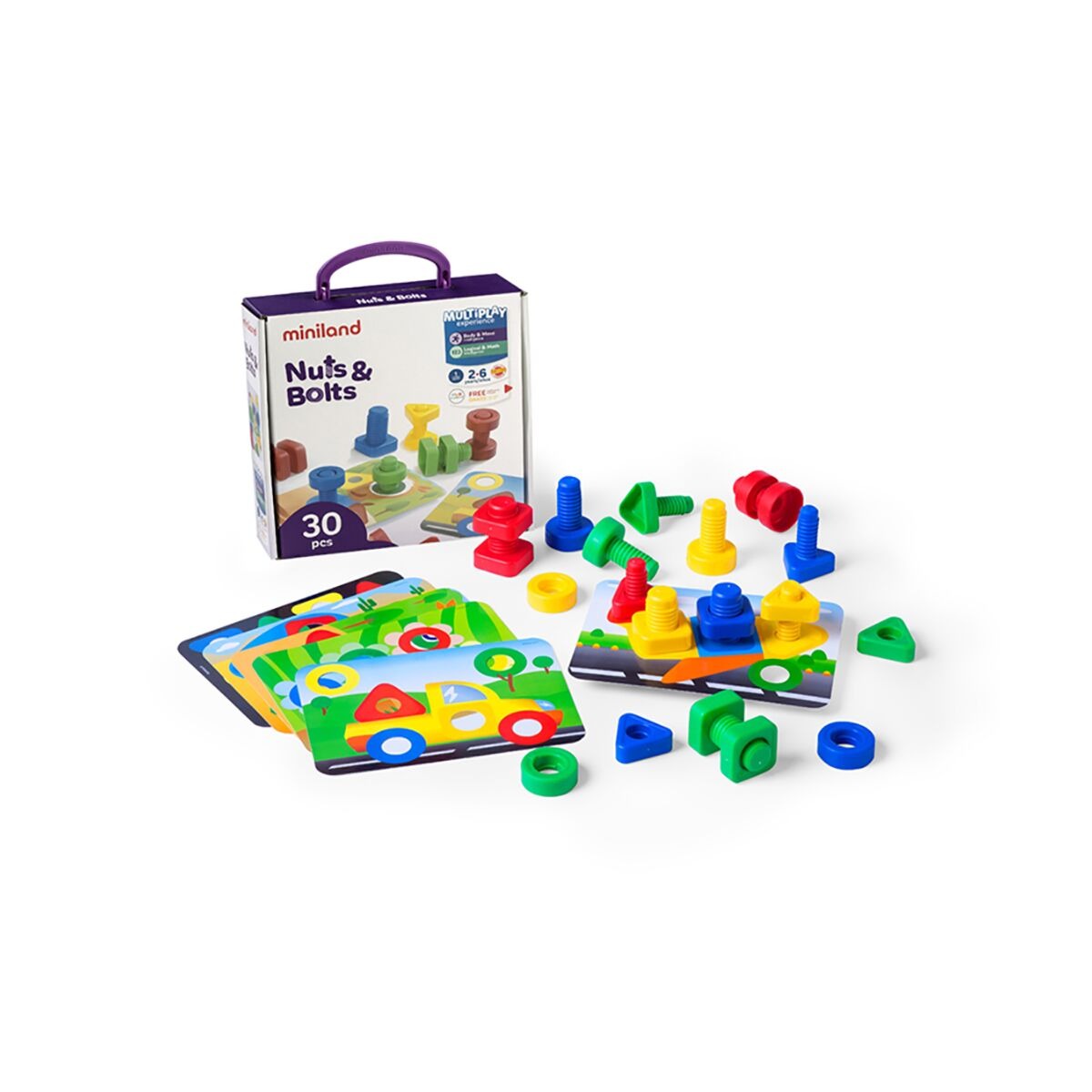 Tuercas y tornillos grandes de plástico resistente, con 3 formas básicas: círculos, cuadrado y triángulo. Este juego mejora la destreza motora fina, coordinación ojo-mano. Set incluye 12 tornillos, 12 tuercas y 6 tarjetas de juego. Para niños de 2 a 6 años.