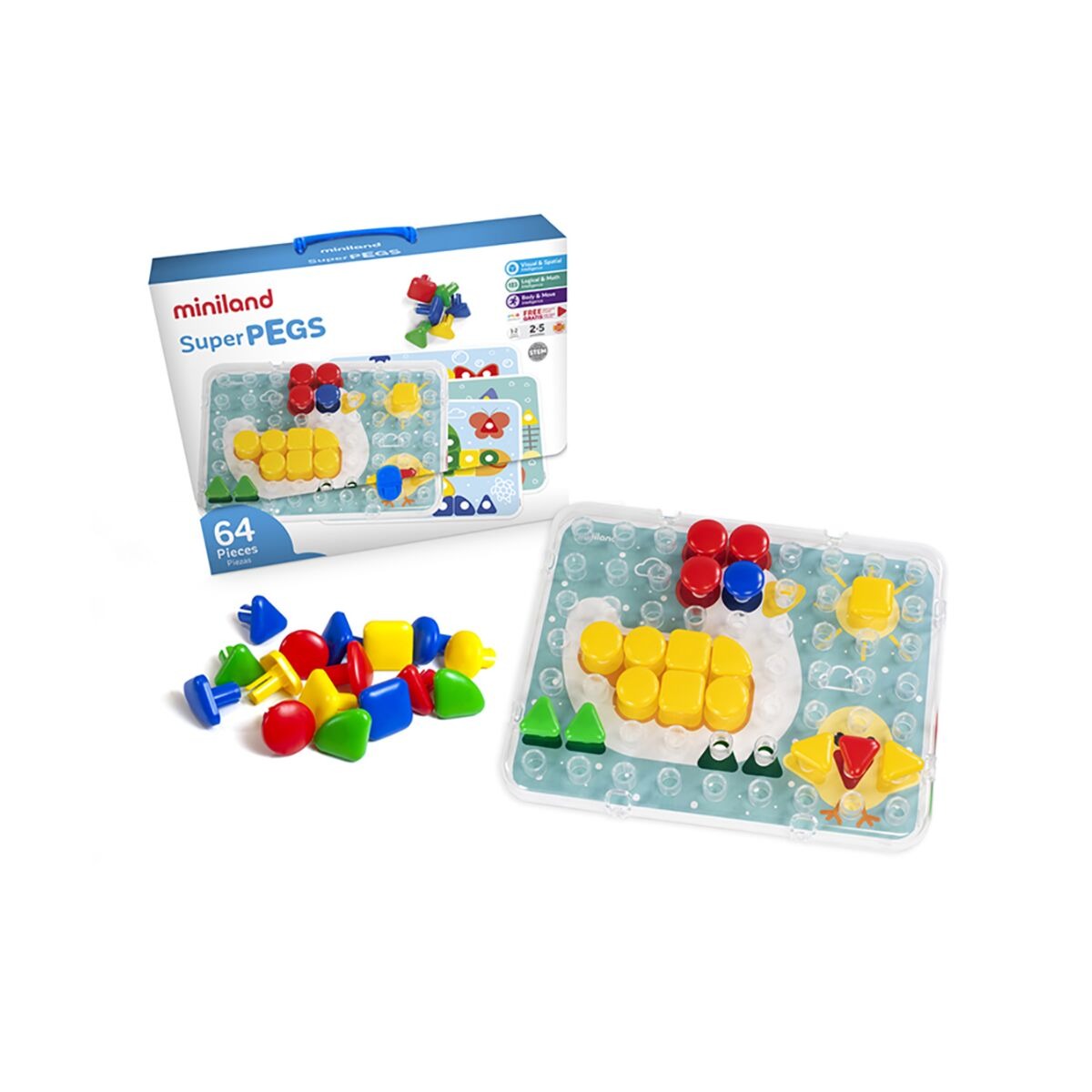 Juego de clavijas grandes fáciles de manejar y que se fijan en el tablero perforado. Viene en 4 formas diferentes, en 4 colores distintos. Set incluye 1 bandeja, 64 clavijas y 4 tableros de cartón. Recomendado para niños de 2 a 5 años